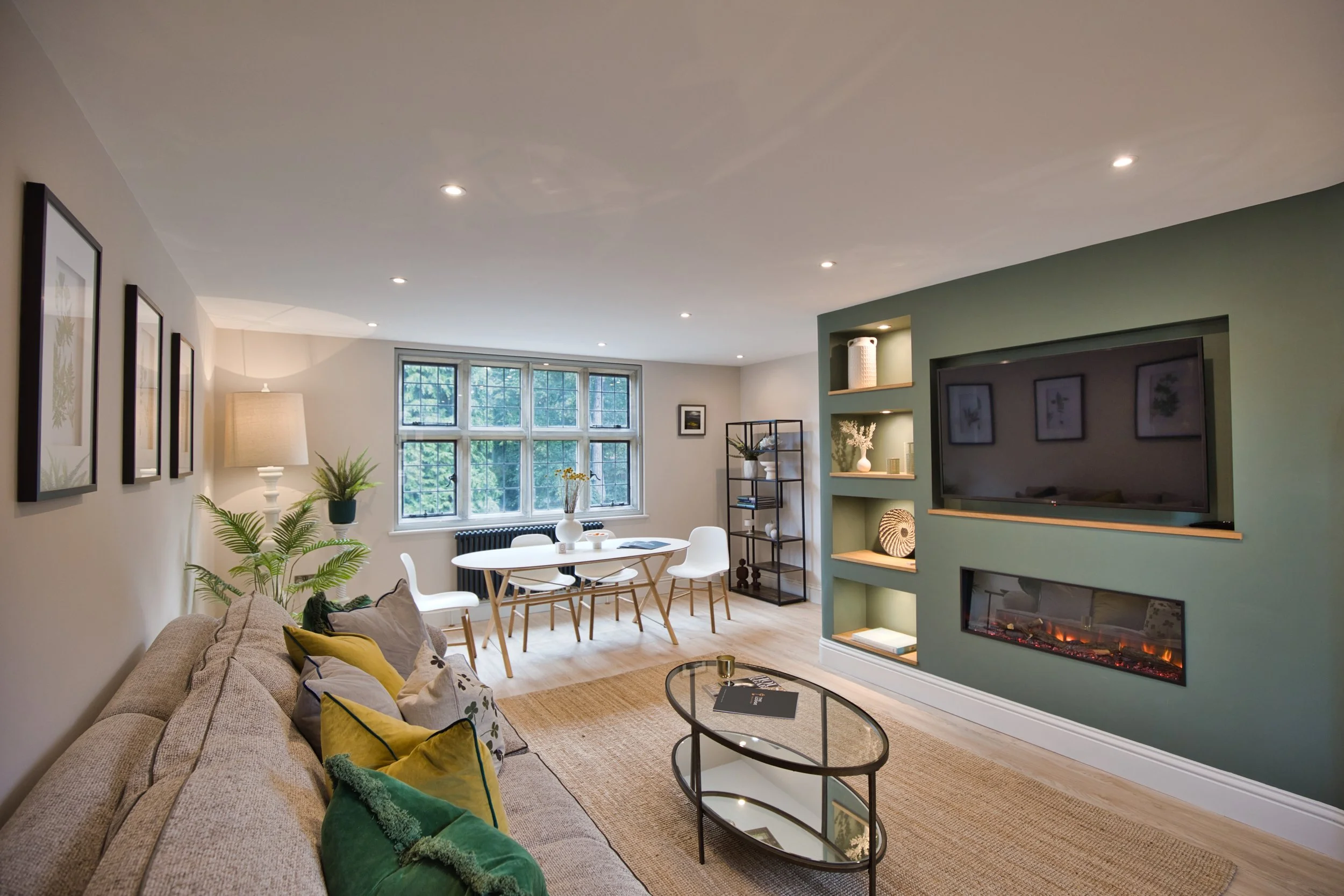 Open-plan living and dining area complete with modern TV, media and fire unit.