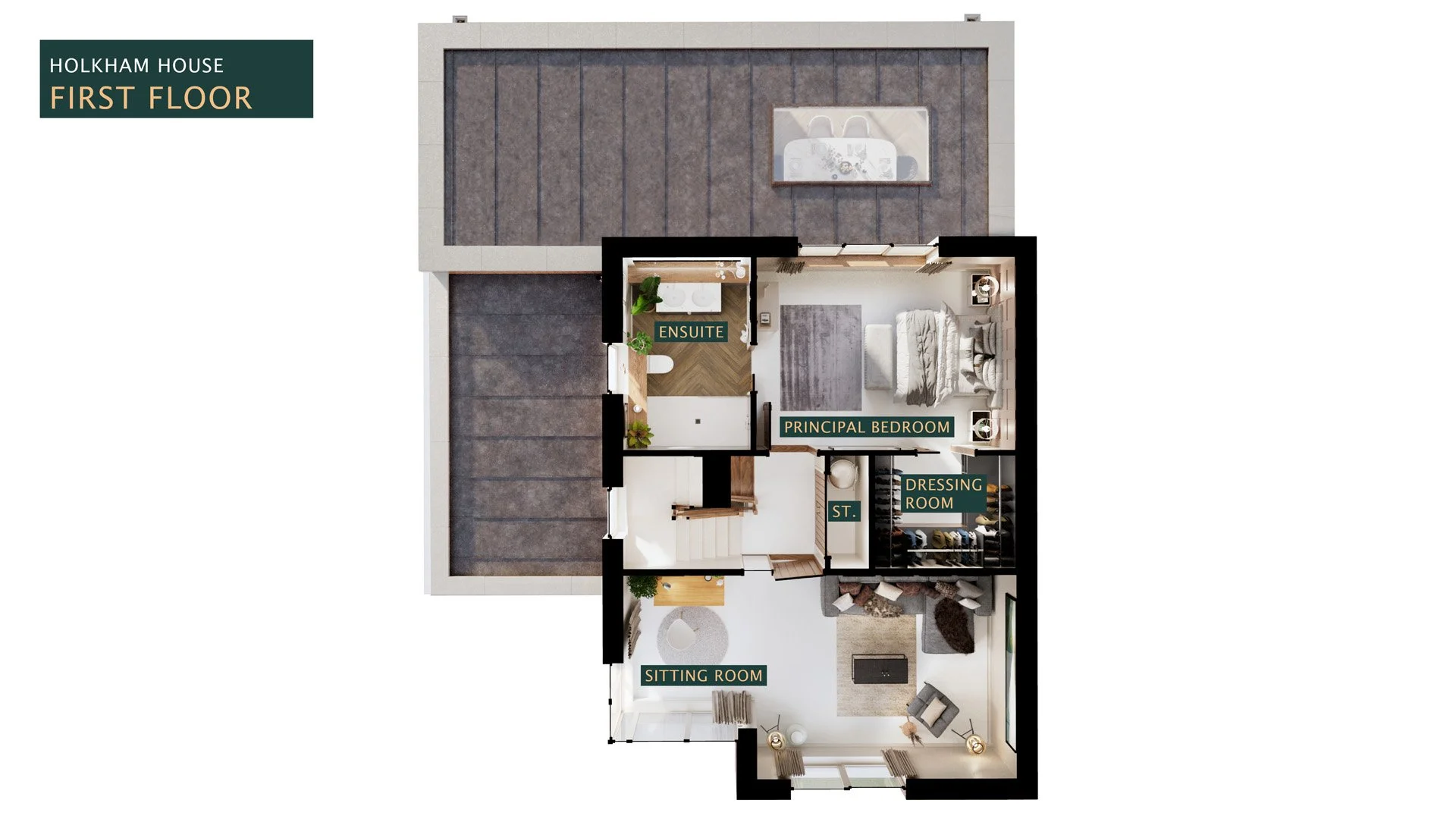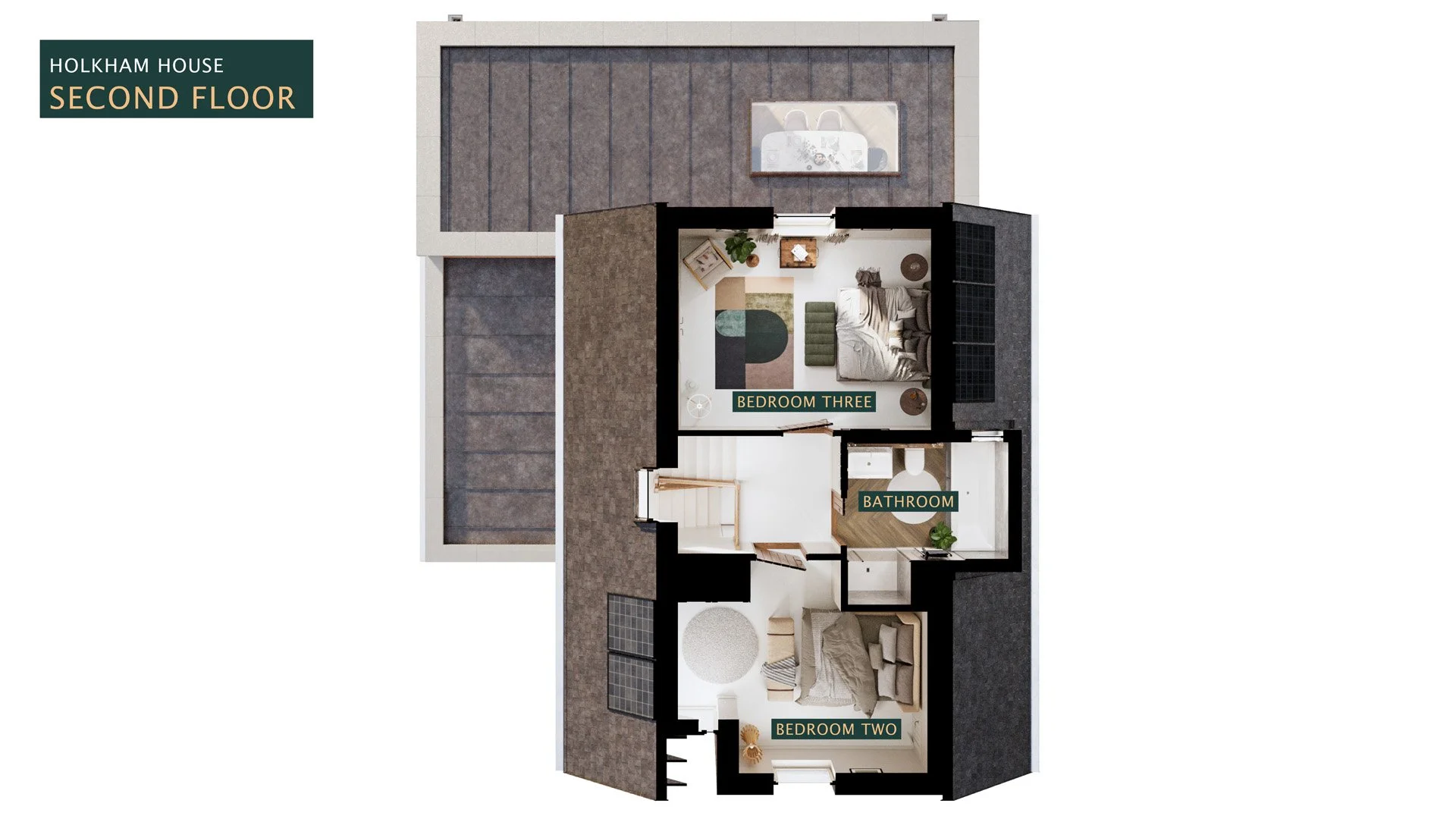 Tucked away on the top floor for privacy, these bright dual-aspect rooms feature eaves storage, optional built-in wardrobes, and a shared stylish bathroom—ideal for families or guests.